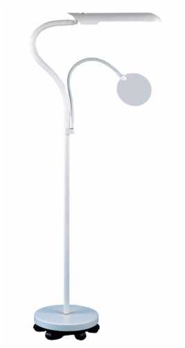 Light and lens are mounted onto individual flexible arms enabling the most comfortable working position. Large rimless magnifying lens gives an un-interrupted view and is removable for easy portability. Floor standing model can be used while in an armchair or at a table. Lens: acrylic, 5" diameter, 3-diopter (1.75 x magnification). Light source: 18 watt energy saving, lowheat daylight bulb. Included: Floor Stand on wheels, bulb, and long electrical cord UL Approved. Color: White. Approx. 52" (130cm) high.