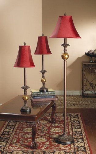 - This set of lamps features with triple glass ball accents, gold and crackle bronze finish and red round bell shade.