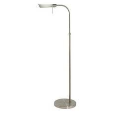 A classic pharmacy floor lamp in a handsome contemporary look. A Sonneman design. One slim column arcs to support the adjustable pharmacy lampshade. An adjustable height gives you full versatility. Satin nickel finish. A built in hi/lo switch allows for easy lighting control. Includes one 75 watt halogen bulb. Adjusts from 37 1/2" to 46 1/2" high. 14 1/4" extension. 10" diameter base.