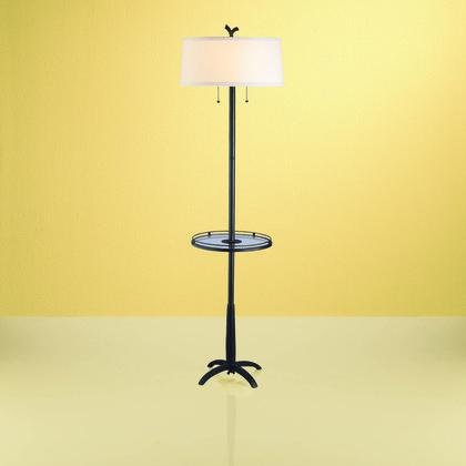 This handsome floor lamp combines form and function. Its round tray provides space for placing small objects, or setting down a drink, book, or magazine. The lamp features twin on-off pull chains allowing for multiple light levels. It has a black metal body and comes complete with an off-white textured herringbone hard-back shade. DL # 235937.