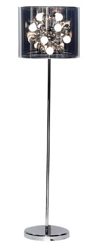 Make a fitting display with aa Adesso Starburst Floor Lamp. Made of metal with a chrome stick pole and flat round base with a dark gray tinted translucent shade, reminiscent of a film negative. The PVC drum shade is also reflective and surrounds a 4-inch chrome sphere from which there are 12 2-inch 25 Watt round frosted candelabra bulbs (included). The Lamp has a foot step switch and is 60-inches in height with a 12-inch diameter base. The shade is 13-inches in height and 16-inches in diameter.