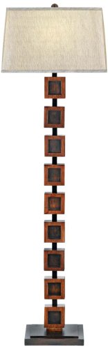 With an eye-catching base of stacked cubes finished in beautiful dark fruitwood, this distinctive floor lamp will add new light and style to your home decor. It is perfectly topped by a light grey fabric hardback shade. Dark walnut finish. Light grey fabric hardback shade. Includes one 27 watt compact fluorescent bulb. ADA on-off rocker switch on base. 65 1/2" high. Shade is 9" x 18" at the top, 11" x 20" at the bottom, and 12" high.