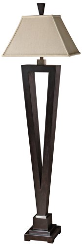 The elegant Elon floor lamp comes in a lightly distressed mocha brown finish with cast aluminum accents. A three-way switch offers lighting level choices, and an off-white linen textile shade tops the piece. Dark mocha brown finish. Off white linen textile shade. Takes one 150 watt 3-way bulb (not included). 68" high. 20" wide shade.