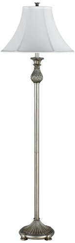 This tropically inspired floor lamp design features an antique silver finish with a distinctive pineapple accent. It is topped by a stretched bell shade. A look that's at once elegant and festive. Antique silver finish. Stretched bell shade. Takes one 100 watt bulb (not included). Push-through socket switch. 18" diameter shade. 60" high.