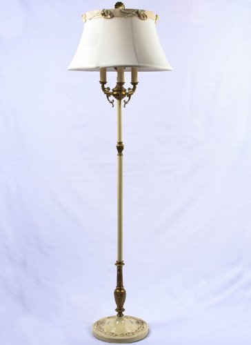 This classical vintage six-way floor lamp has hand painted details on the base and gold accents on a bisque finished column.Ê This piece has been carefully restored to its original beauty with new electrical components by the skilled craftsmen at Restoration Lighting Gallery.