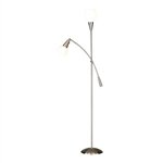 "Each Cupola lamp has a sating steel finish and white frosted glass shades. 150 Watt floor lamp with 60 Watt adjustable reading light. On/off toggle switch on each shade. 71"" Height, 11"" Base. Top shade: 6.5"" Height, 6"" Diameter. Reading light: 3.5""