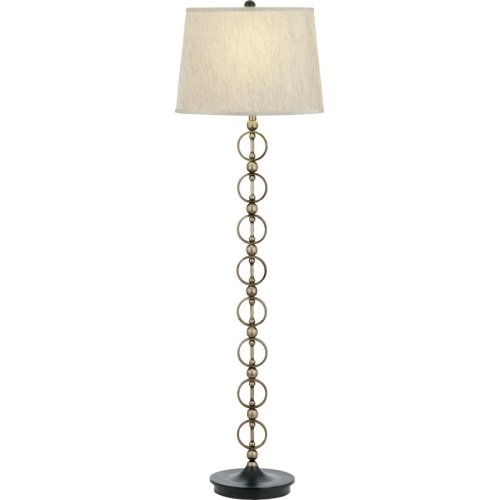 With a distinctive base of stacked rings in a gold finish, this eye-catching floor lamp will bring new style to your home decor. It is perfectly topped by a light grey fabric hardback shade. Antique gold finish. Light grey fabric hardback shade. Includes one 27 watt compact fluorescent bulb. 64 1/2" high. Shade is 16" across the top, 19" across the bottom, and 13 1/2" on the slant.
