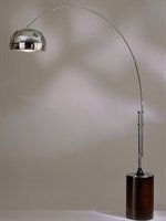This floor lamp, with its arching column, is the ultimate in contemporary design. Features a polished chrome finish with dark brown wood. Takes one 150 watt bulb (not included). Adjusts to 94" high. 70" span. Shade is 13" in diameter.